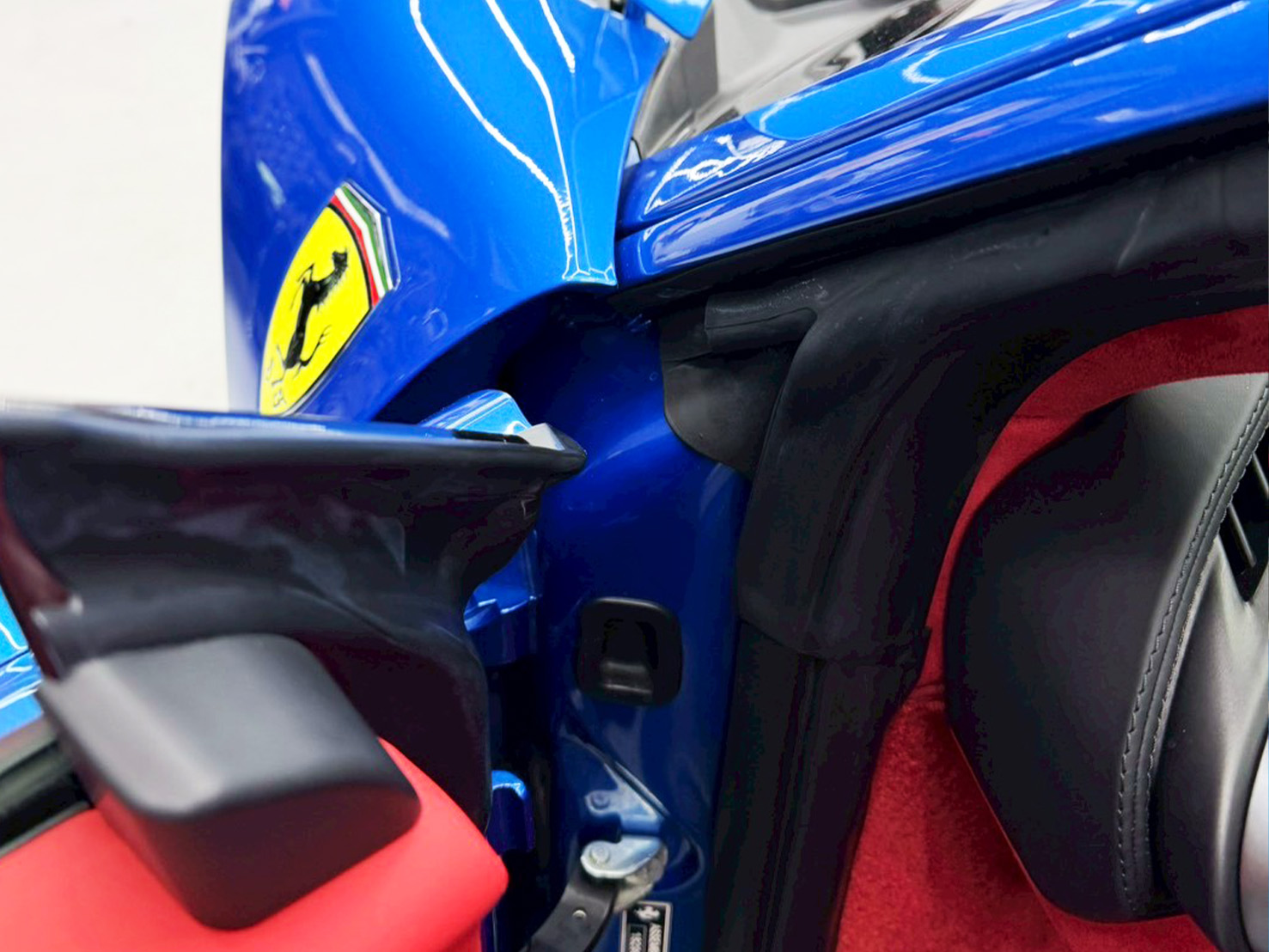 フェラーリ特有の曲面とシャープなエッジを崩さず、「削る」のではなく「整える」下地処理で