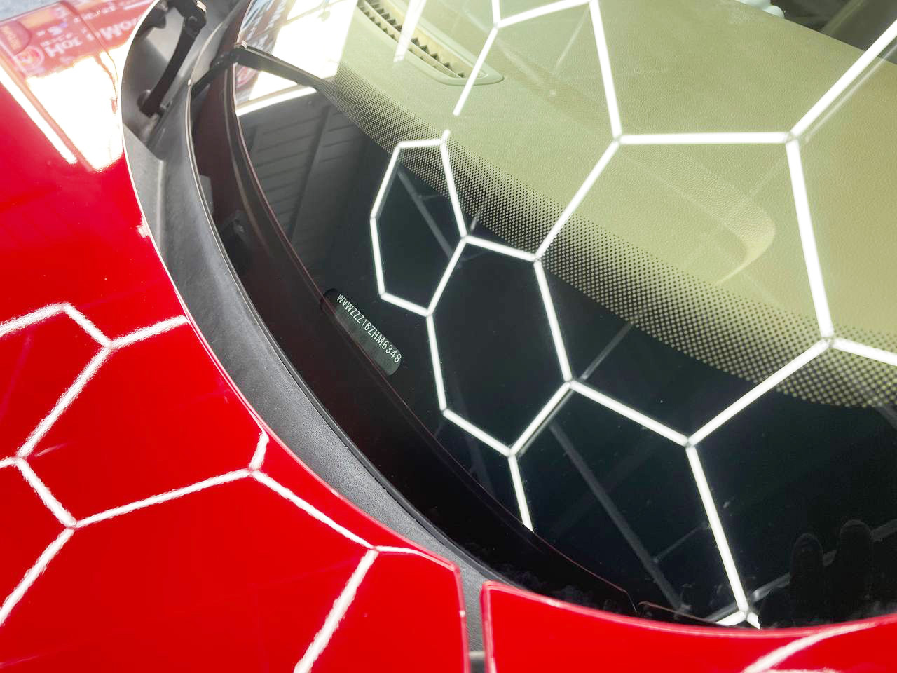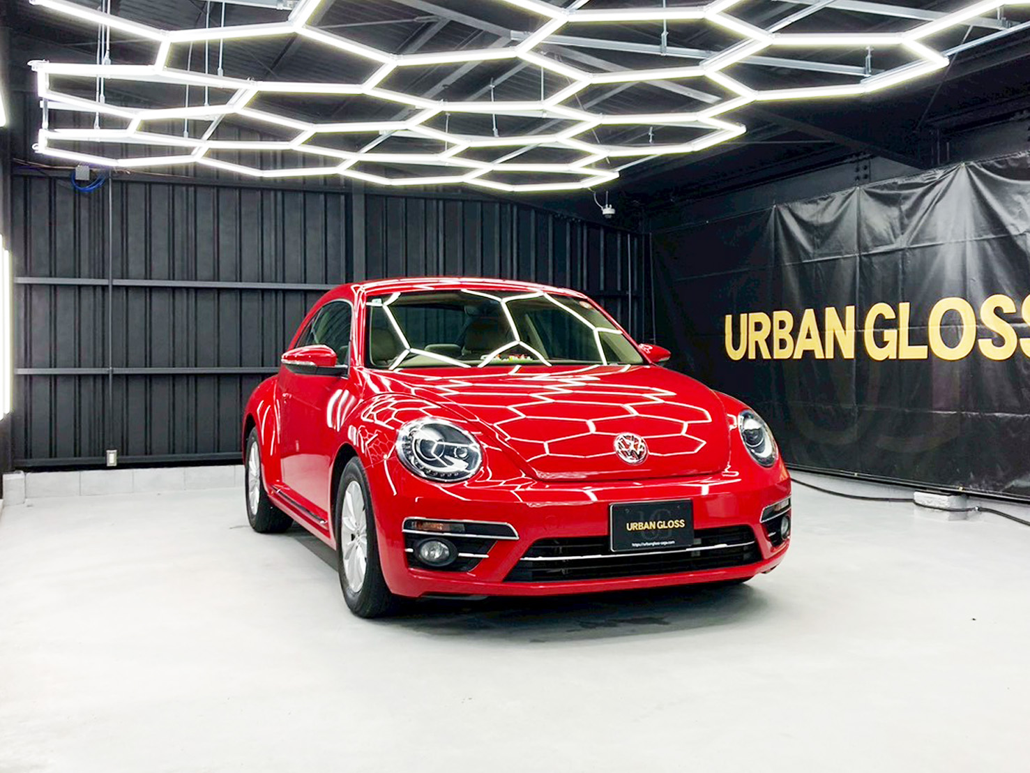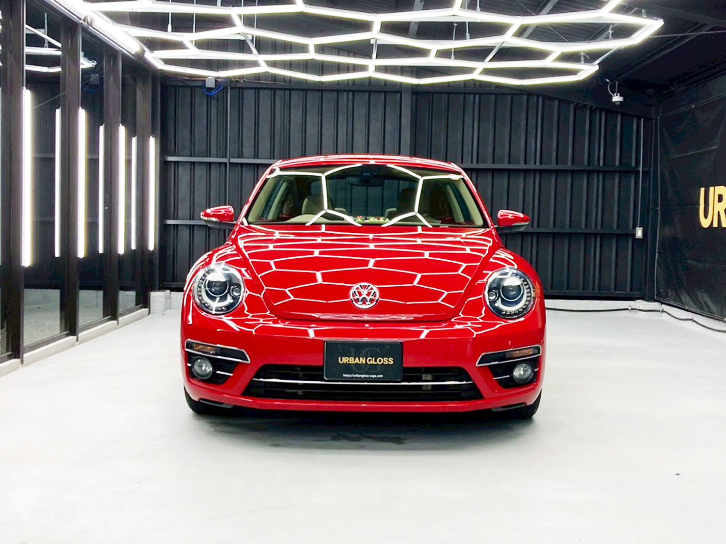 その上に高品質コーティングを均一に施工することで、深みのある赤の発色がさらに際立ち、照明が映り込むほどの鏡面光沢を実現。