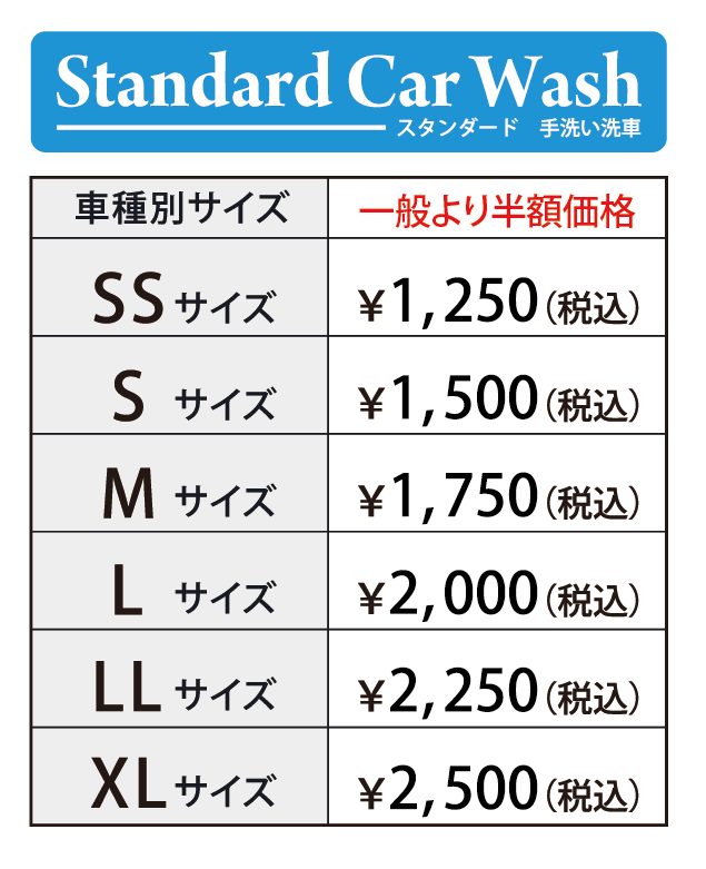 ※スタンダード手洗い洗車(一般価格)料金の半額となります。